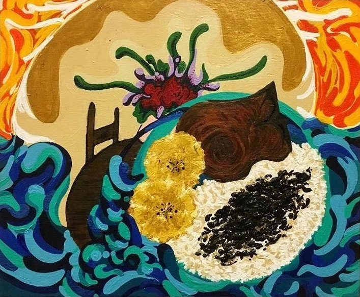 Blue waves are painted at the bottom; the sun in yellow and gold, at the top. A plate of arroz con habicheulas (rice and beans) is in the center, depicted with so much texture it looks like they could be scooped up and eaten. Next to them are fried plátanos (plaintain) with a serving of protein.