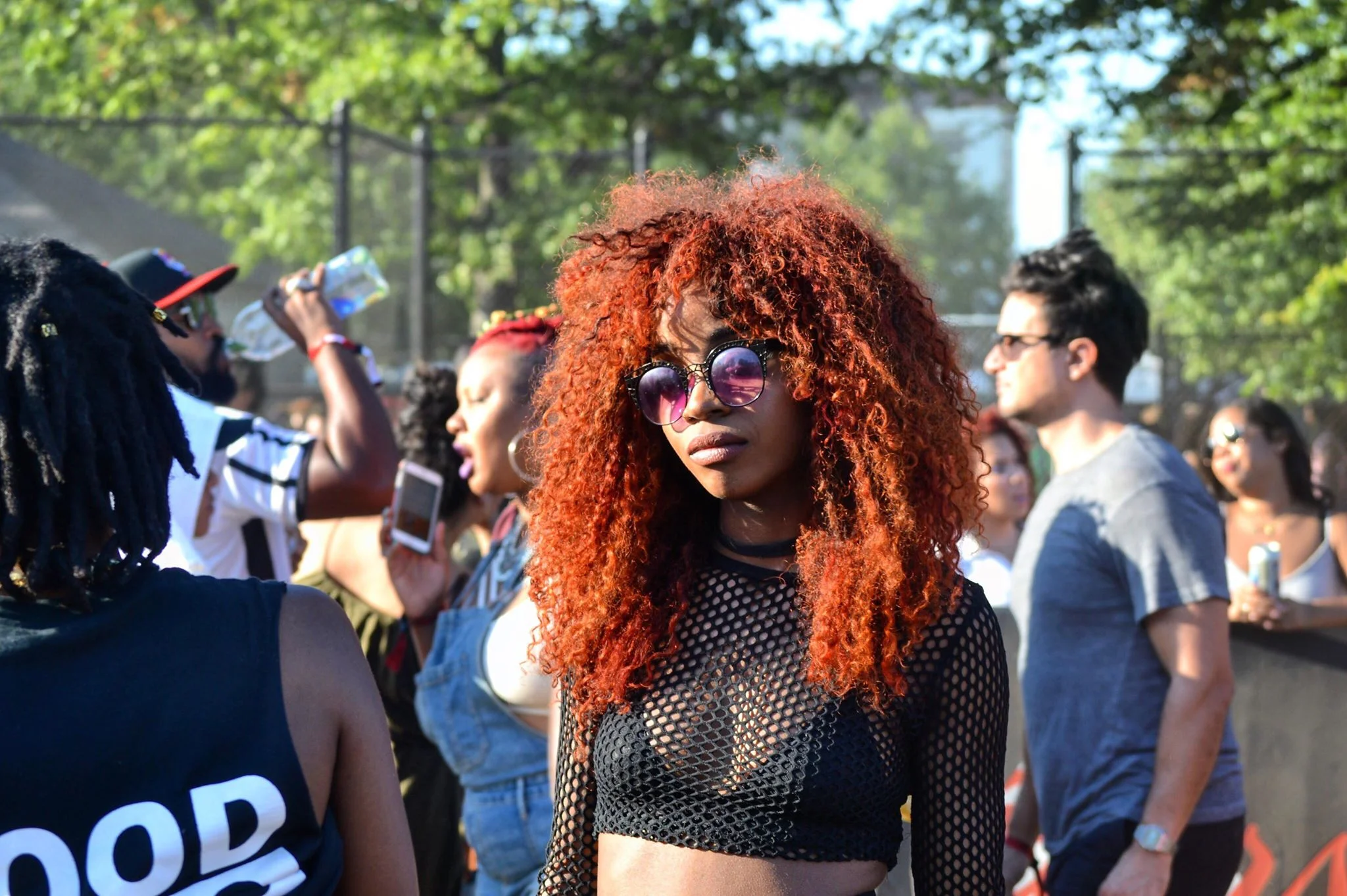 "The photograph depicts a Black femme in a crowd of people outside at Afropunk. They have long, textured red hair and are wearing sunglasses that fade from blue to pink. They are wearing a fishnet crop top with a triangle-shaped bra underneath and have a black choker around their neck.