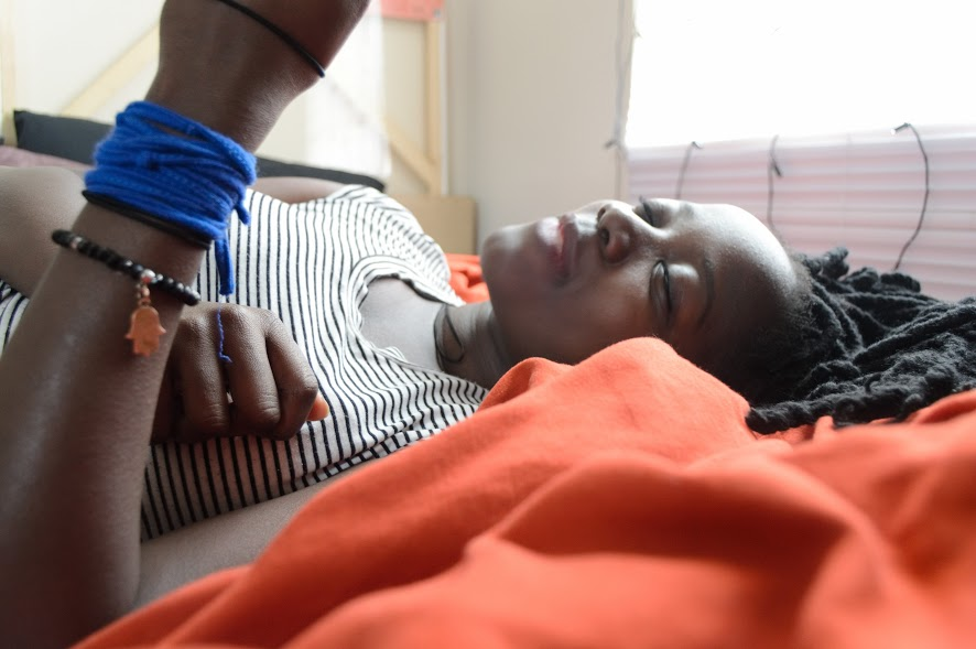 A dark-skinned person is lying down on a bed with orange sheets. The shot is close to focus on the face and torso as the person relaxes. Their eyes are closed, locs splayed on the bed. One arm is raised and wearing a blue wrap bracelet and a beaded bracelet with a hand-shaped charm.